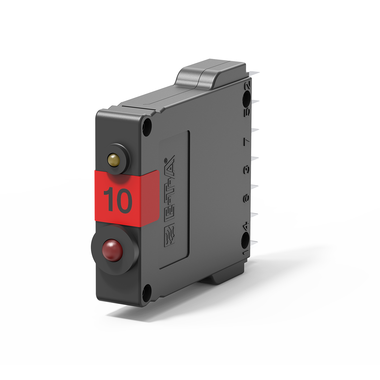 The 7 pin INLINE version is designed for use with various E-T-A terminal blocks, e.g. 17-P10-Si. A choice of current ratings is available from 1 A through 10 A. An operating voltage range of DC 9...32 V allows the connection of DC 12 V and DC 24 V loads.